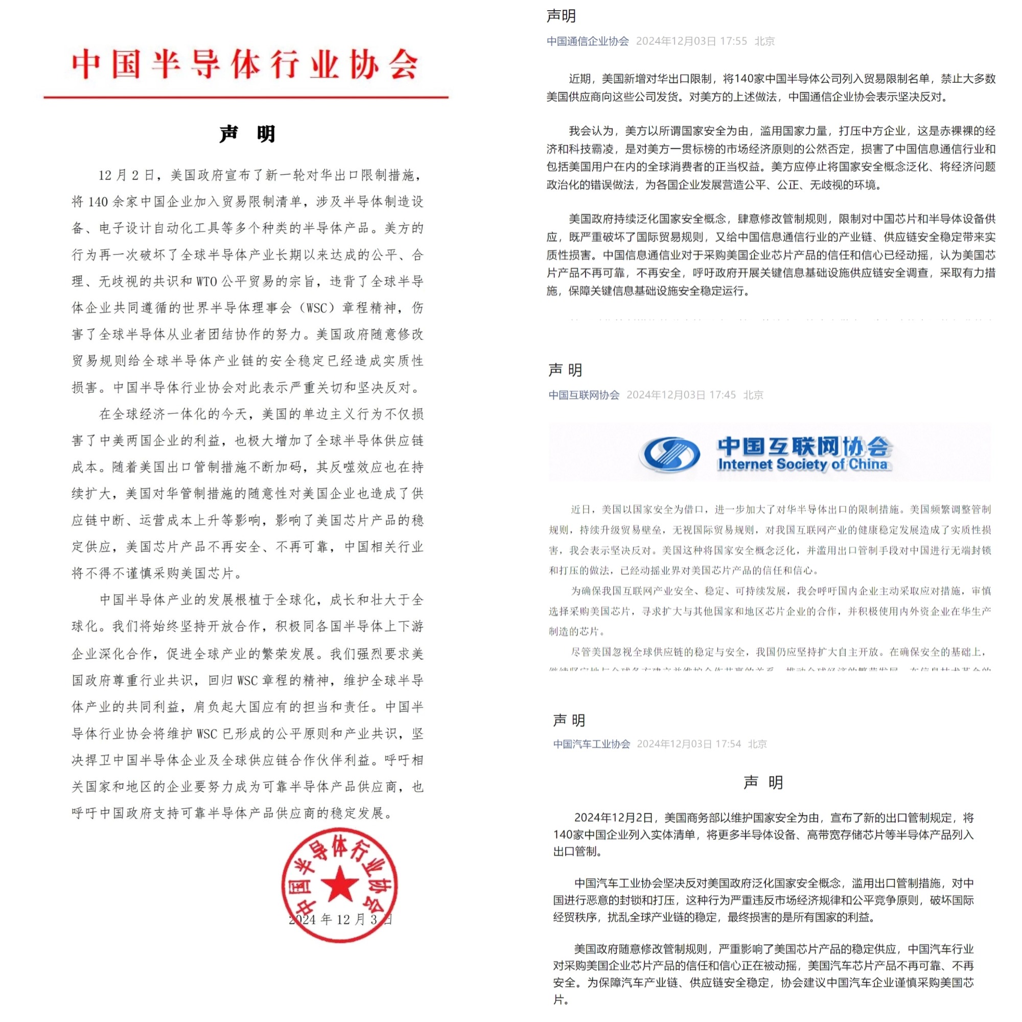 2024年12月2日,美国政府宣布对140余家中国企业实施新的出口管制措施,将多个半导体相关的产品列入限制清单。这些产品包括半导体制造设备、电子设计自动化工具等,直接影响了中国企业对美国芯片的采购能力。12月3日,中国半导体行业协会、中国互联网协会、中国汽车工业协会和中国通信企业协会四大行业协会联合发布声明,强烈反对美国的出口管制行为,称美国芯片产品不再安全、不再可靠,并呼吁国内企业审慎选择美国芯片。