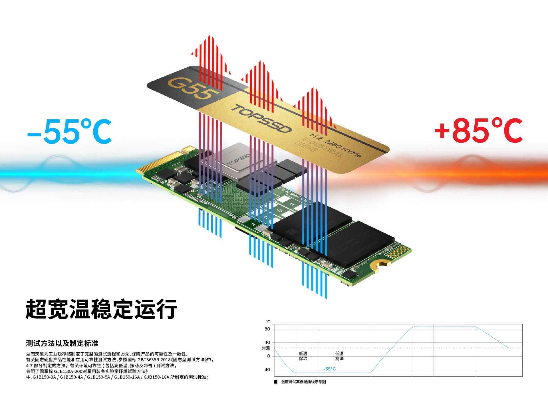有了高精度温度传感器的辅助,天硕G55 Pro M.2 NVMe 工业级SSD可确保不在过热状态下运作而导致设备毁损,不仅能在超宽温域(-55℃~85℃)维持系统的正常稳定运行,更能延长自身使用寿命,增加成本效益。