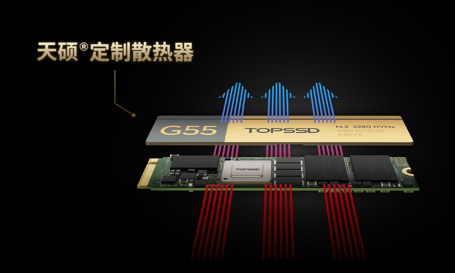 然而,天硕研发团队执着于“精益求精”。为了进一步提升SSD嵌入工业设备后的散热效率与运行稳定性,天硕G55 M.2 NVMe 工业级固态硬盘标配薄型铝合金定制散热器。
