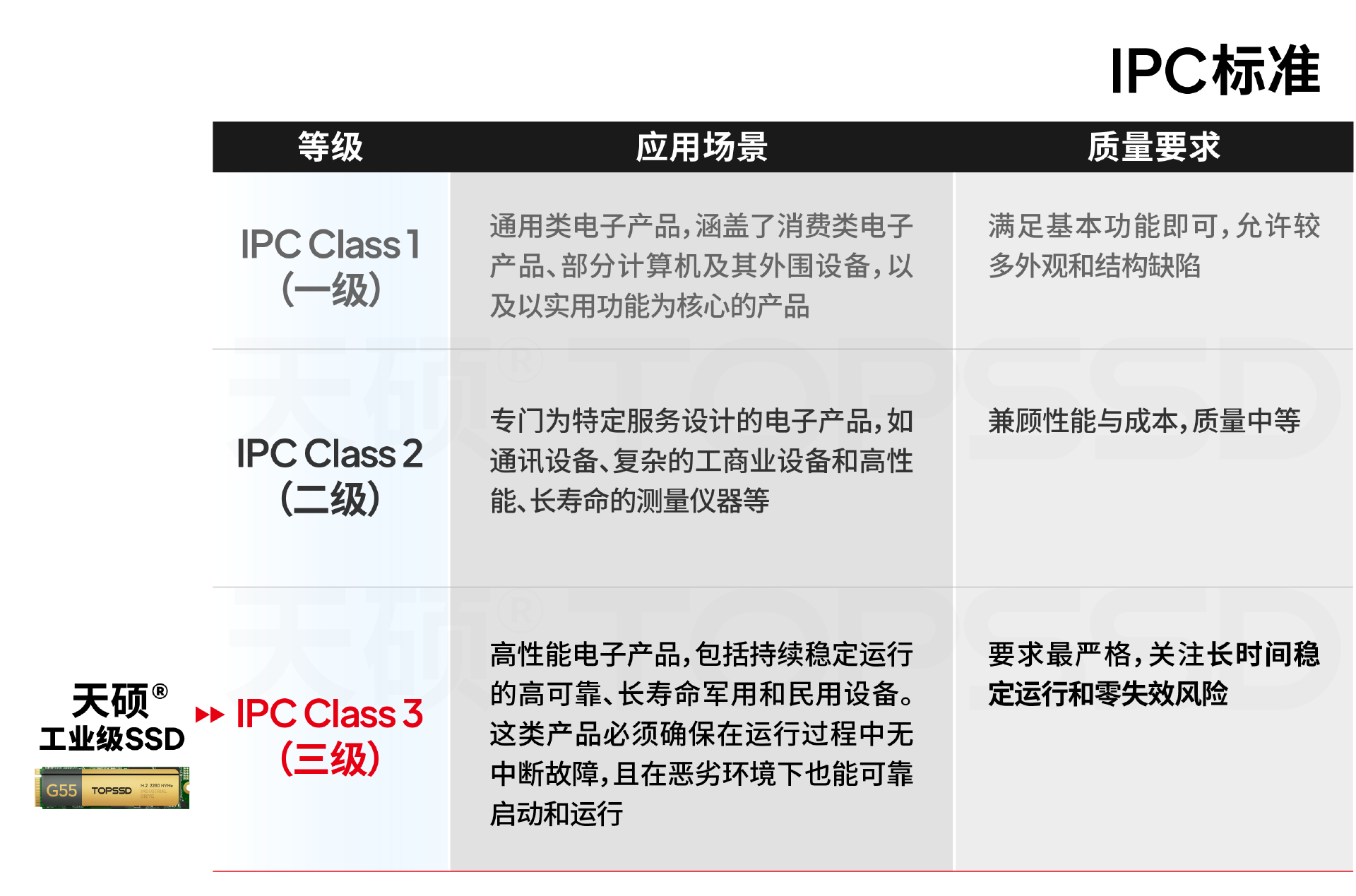 作为工业存储领域的专业厂商,天硕(TOPSSD)深知对工业级存储设备来说,可靠性与稳定性始终是第一要义。因此,天硕严格把控产品的PCB电路板的设计与制造质量,全面对标并符合IPC-A-600 Class 3(IPC第三级)标准,为SSD在极端工况中的稳定运行提供坚实保障。
