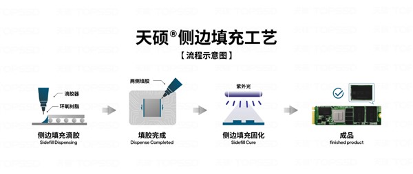 在工艺层面,天硕团队采用高精度填胶设备。相比覆盖芯片底部的传统填充技术,侧边填充仅处理边缘区域,不仅固化更快、重量更轻,还保留了维修可行性,兼顾了生产效率与后期维护的灵活性。填充完成后,天硕会通过紫外光对树脂进行可控热固化,确保其快速均匀反应并优化粘接强度与弹性。最后实施多重质检,严格验证防护层可靠性后才会进入后续工序。