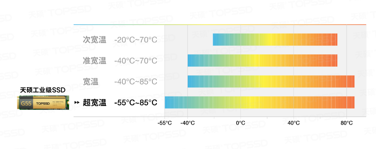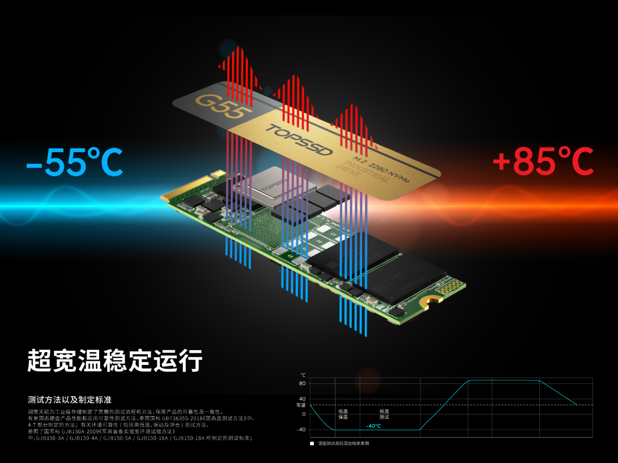 在严苛的智能制造、航空航天及户外工业环境中,温度剧变是影响存储设备稳定性的最大挑战。天硕(TOPSSD)凭借自研主控芯片和深厚的固件技术积累,将天硕G55 Pro M.2 NVMe SSD的工作温域扩展至令人瞩目的-55℃~85℃超宽温级别,为关键数据筑起坚实防线。