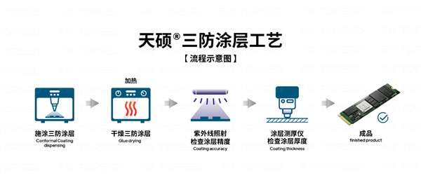 天硕三防涂层的核心优势在于从选材到工艺再到验证的全程精益求精。天硕(TOPSSD)选用专为高可靠性电子设备设计的高性能聚合物涂层材料,具备优异的附着力、弹性、耐化学性和长期稳定性,为固态硬盘的核心组件奠定坚实基础防护。