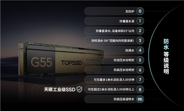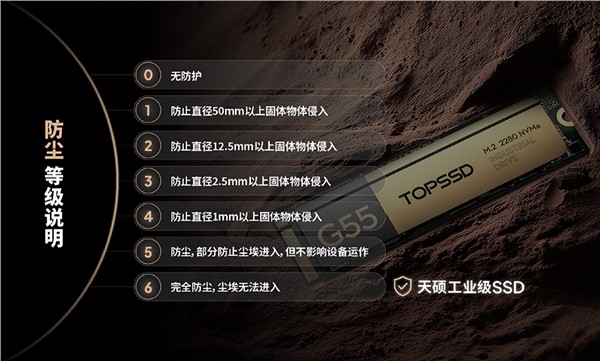 天硕(TOPSSD)工业级固态硬盘符合IP68标准,拥有卓越的防尘防水性能:其防尘能力达到最高等级(6),完全隔绝灰尘;防水性能优于IP67标准,甚至可适应长时间的水下环境;即使在潮湿重、粉尘多、污染重的极端环境中也非常耐用。