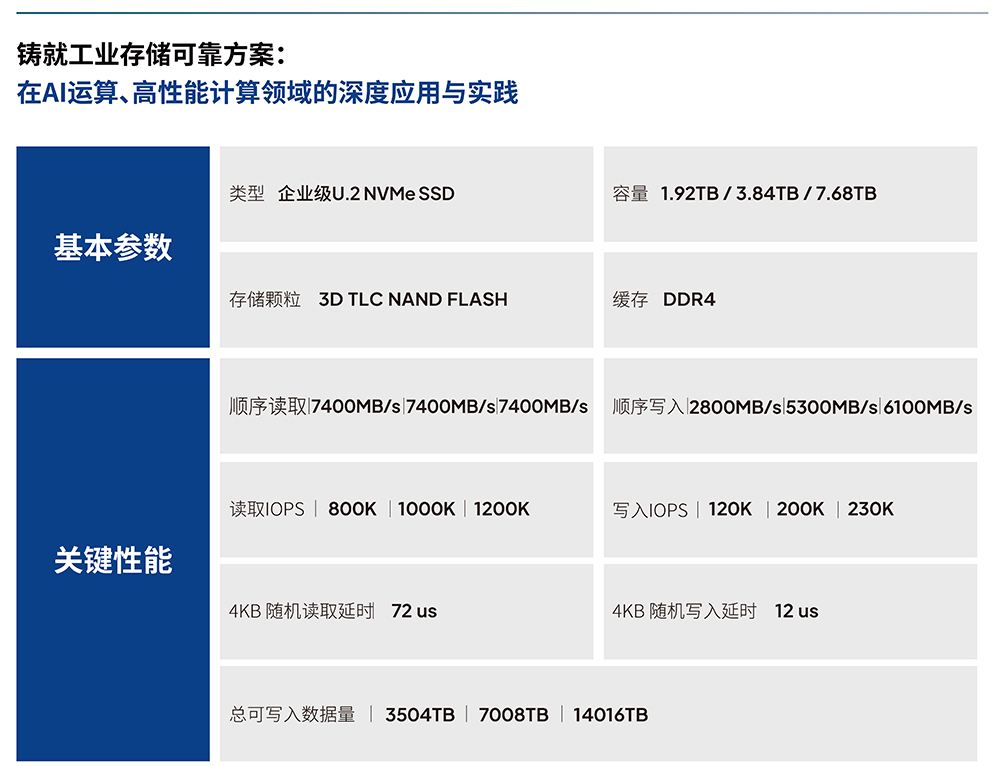 • 使用长江存储3D TLC存储颗粒,容量范围覆盖1.92TB~7.68TB